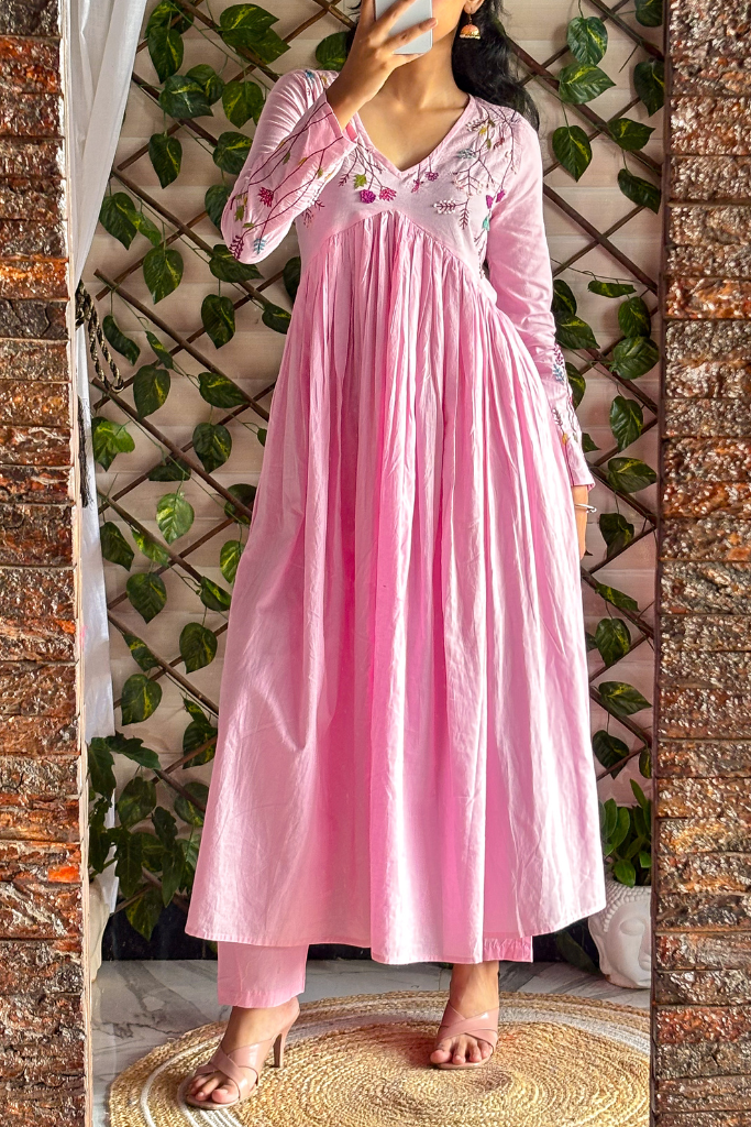 A soft blush pink kurta set, brought to life with floral thread embroidery. Feminine, flowy, and perfect for day outings or festive ease 🌸✨