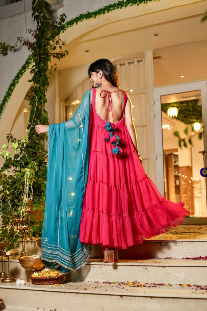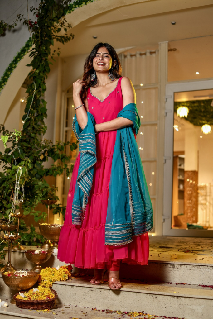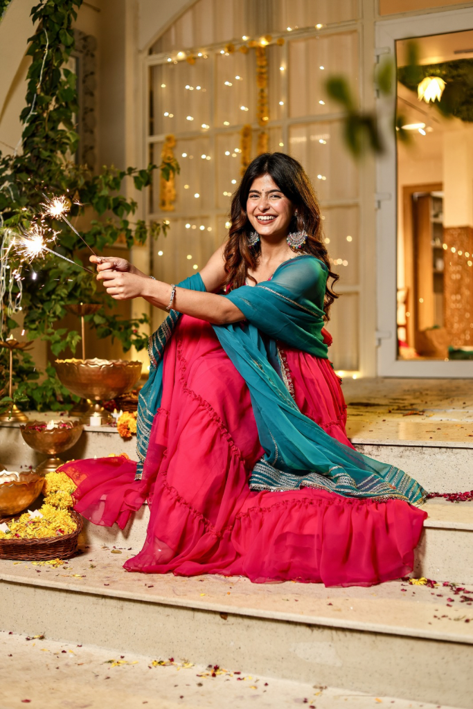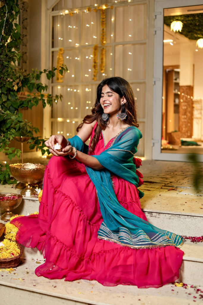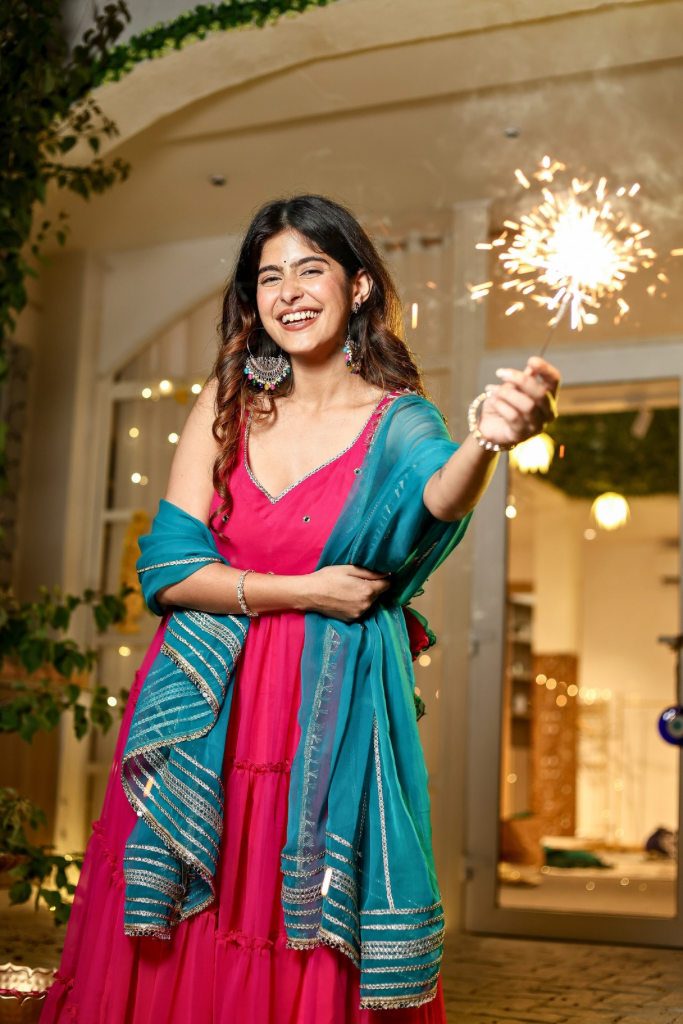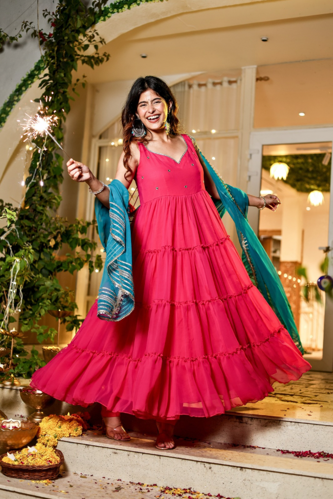 Girlies, this look is a straight-up fire! This stunning chiffon Anarkali, with its heavy dreamy flare and mirror work detailing on the yoke, is all about bringing those festive vibes to life. Paired with a dupatta that sparkles and cotton lining for all-day ease, it’s the ultimate outfit to light up your Diwal. Don’t miss out on this pataka piece!