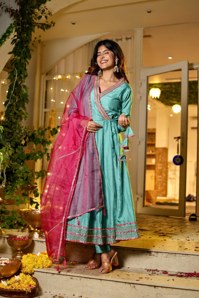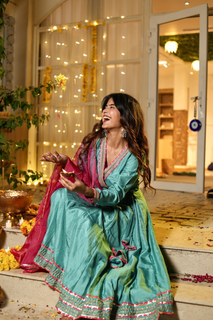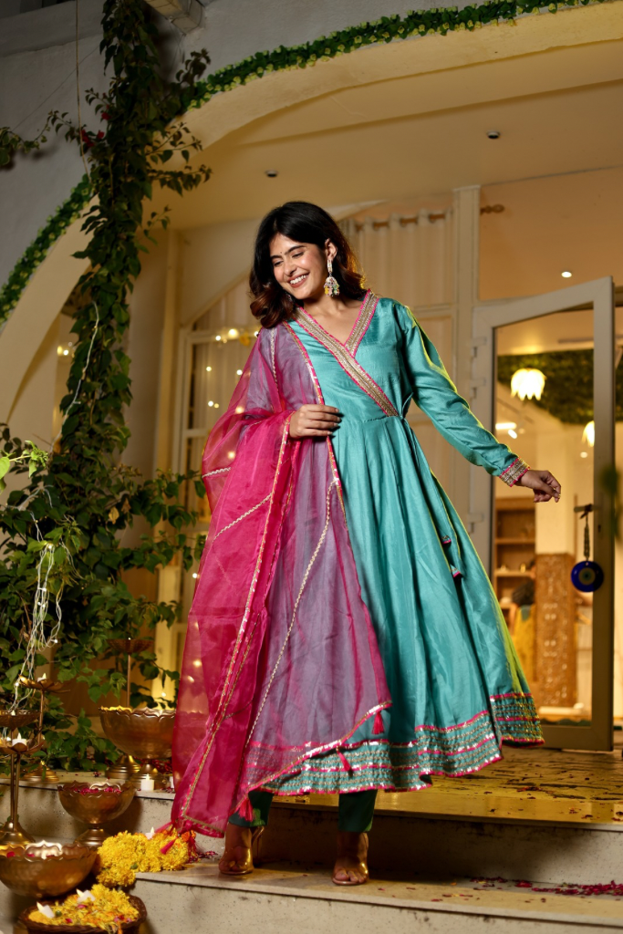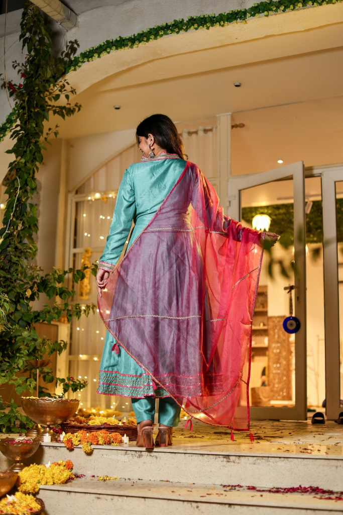 Festive season, we’re coming for you! Glide through the festive season in our silk anarkali suit set, detailed with dreamy lace and paired with a flowy organza dupatta. With cotton lining to keep you comfy and stylish, this look's all about making you the belle of every celebration!