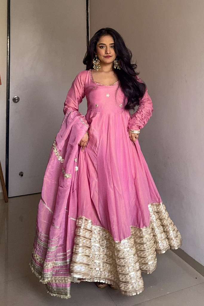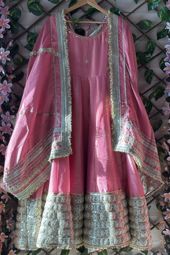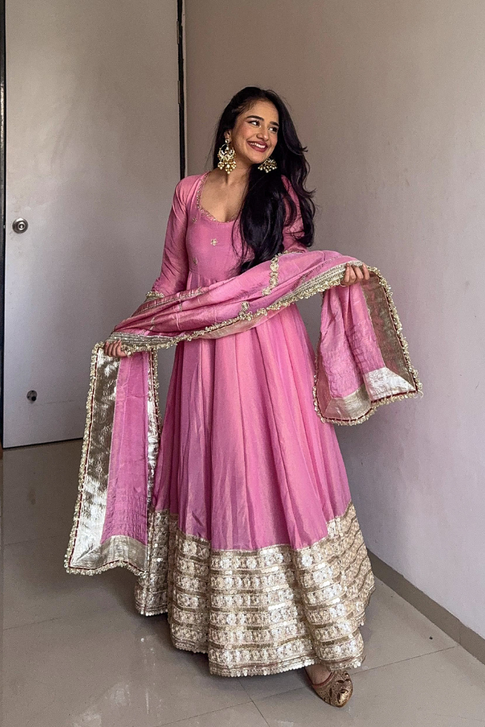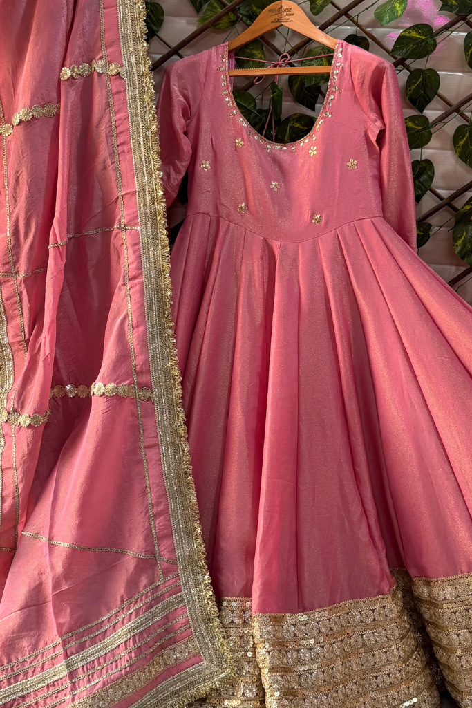 Wrapped in a dreamy shade of pink, this tissue Anarkali suit is no less than couture magic. With delicate handwork, intricate lace detailing, and that extra flare that twirls like a fairytale—this one's made for main character moments. Perfect for weddings, sangeets or when you feel like turning the vibe from sweet to stunning. Pretty meets powerful—just like you.