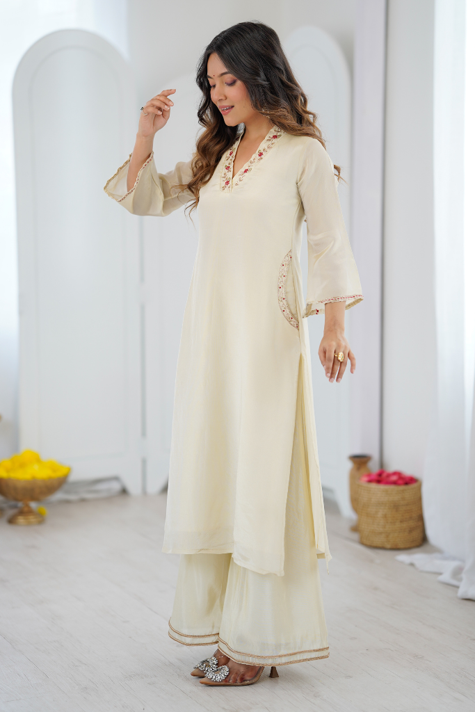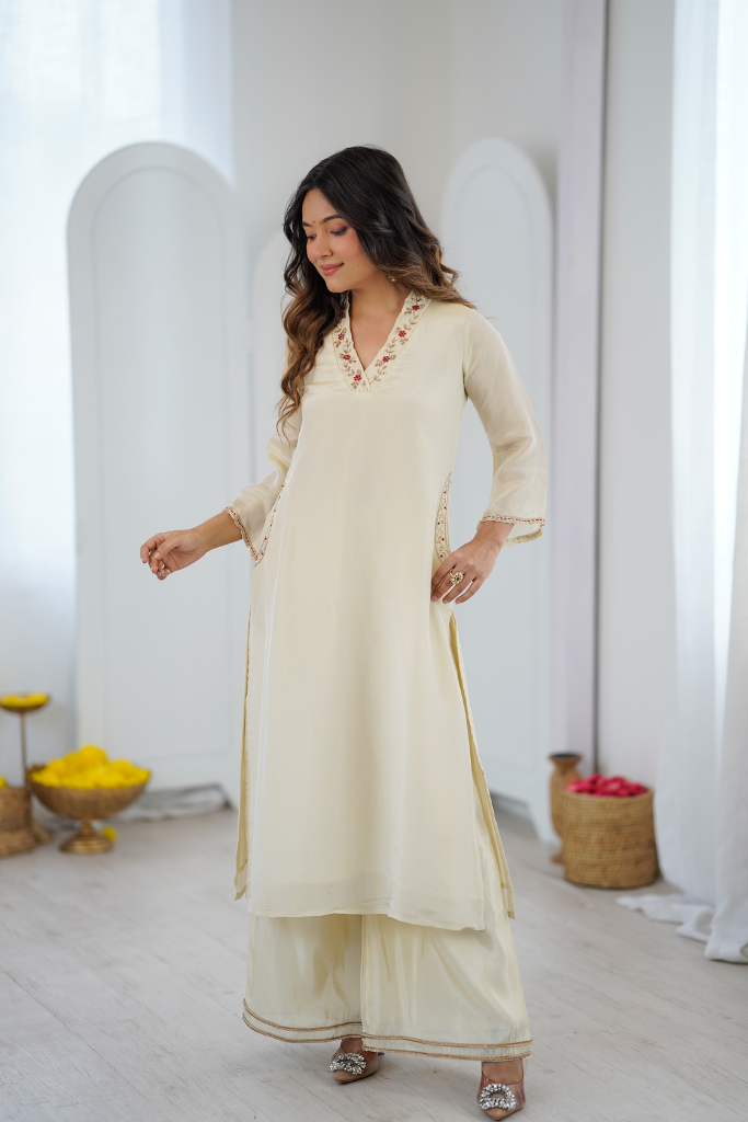 Tissue coord with handwork on neckline, sleeves, and pockets on both sides — effortless and elegant.