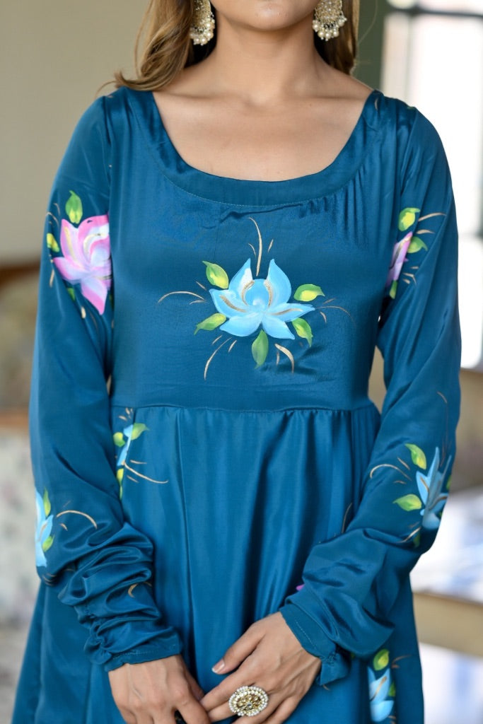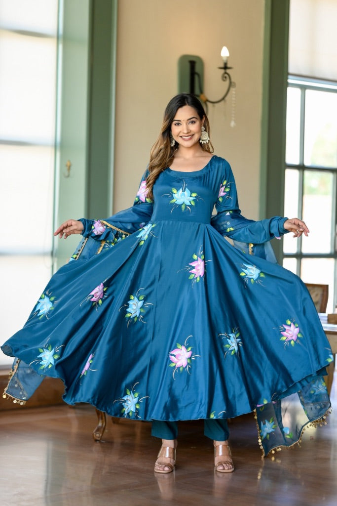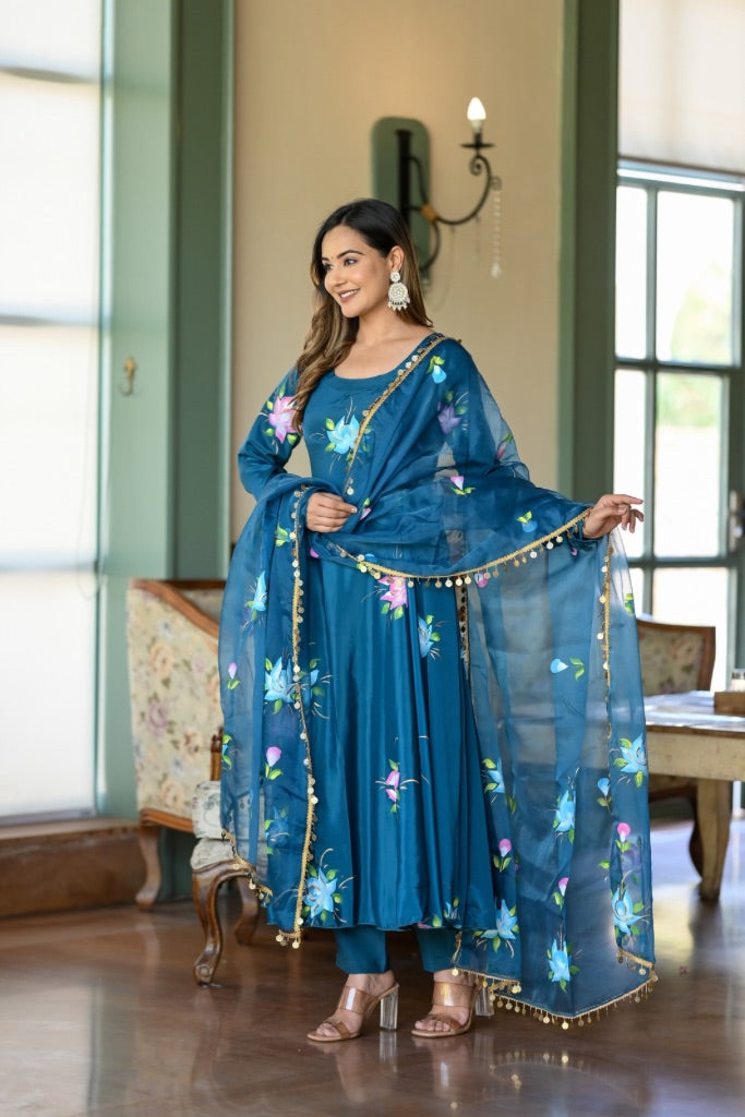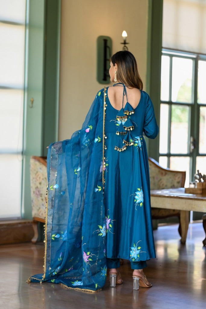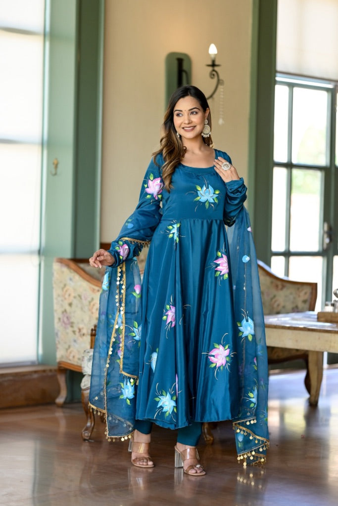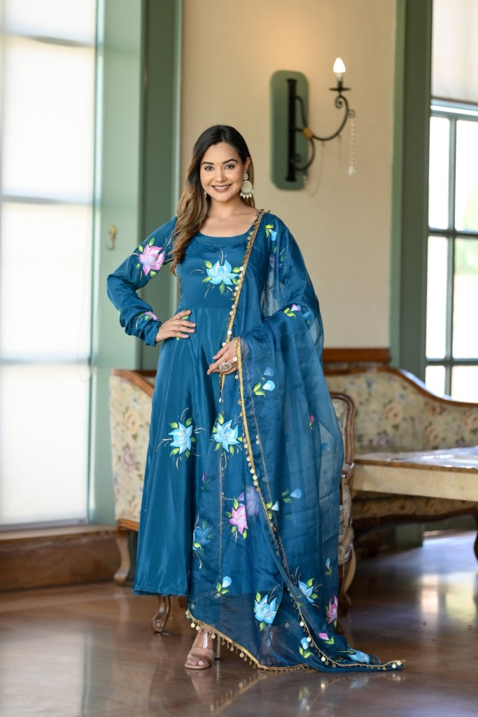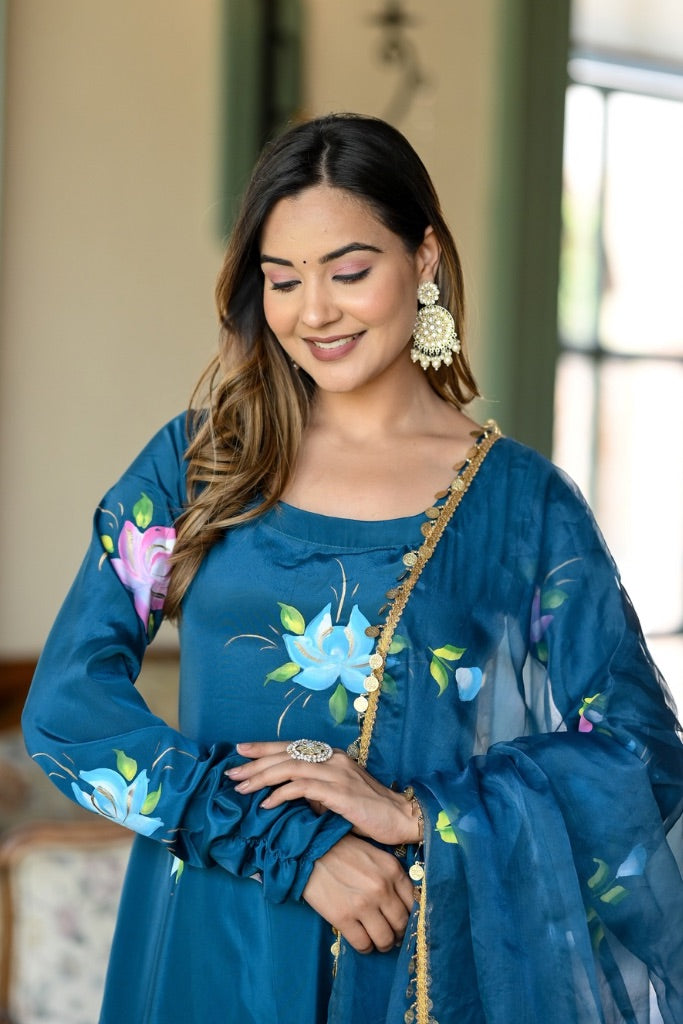 Ditch the ordinary and opt for extraordinary with our handpainted crepe silk anarkali set.The intricate brush painting with good impact adds a unique touch of elegance, while the flowy silhouette and organza dupatta with coin lace detailing ensures you'll stand out on any occasion. Whether you're attending a wedding or celebrating a festival, this ensemble guarantees any occasion!