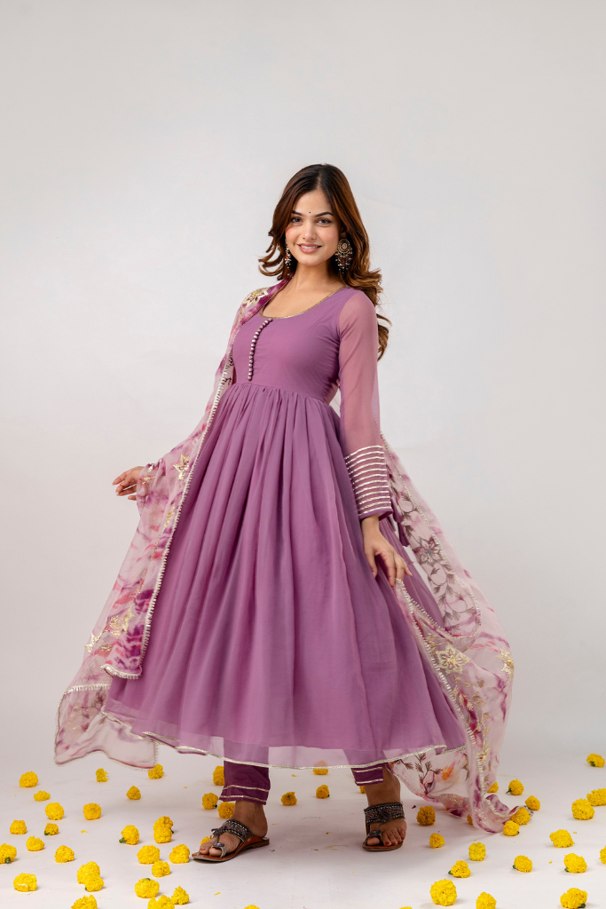 Featuring a georgette Anarkali with cutdana handwork detailing on the neck, intricate Gota work throughout, and a dazzling Kachhi Gota dupatta, this outfit is here to make sure you stay booked, busy, and blessed with compliments.