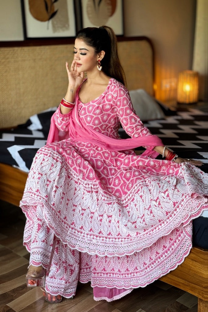 Step into a world of regal grace with our Heavy Chikankari Anarkali Suit Set. The exquisite full-flair Anarkali is complemented by intricately designed Chikankari palazzo pants and a chiffon dupatta featuring delicate Chikankari lace. Perfect for weddings, festivals, and special gatherings.